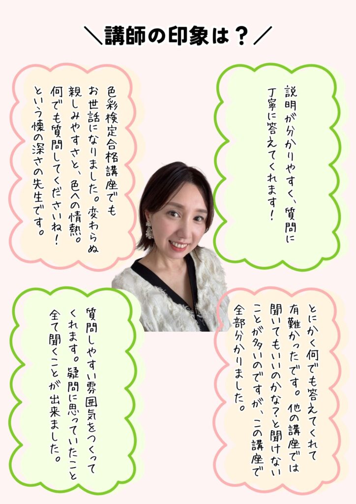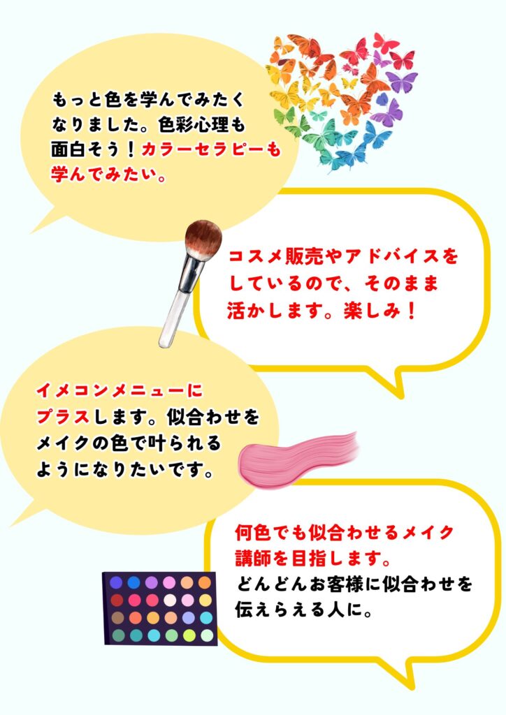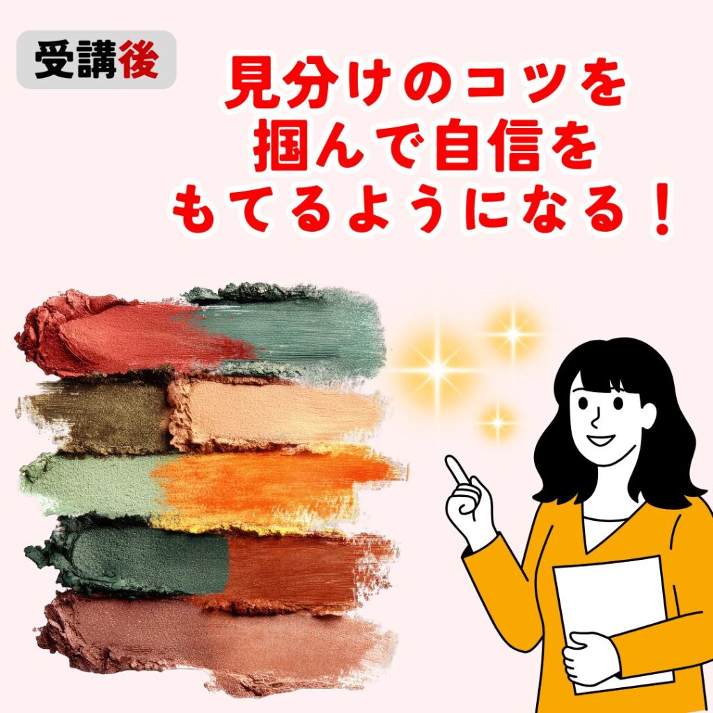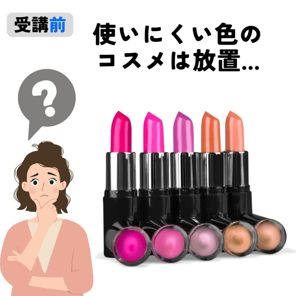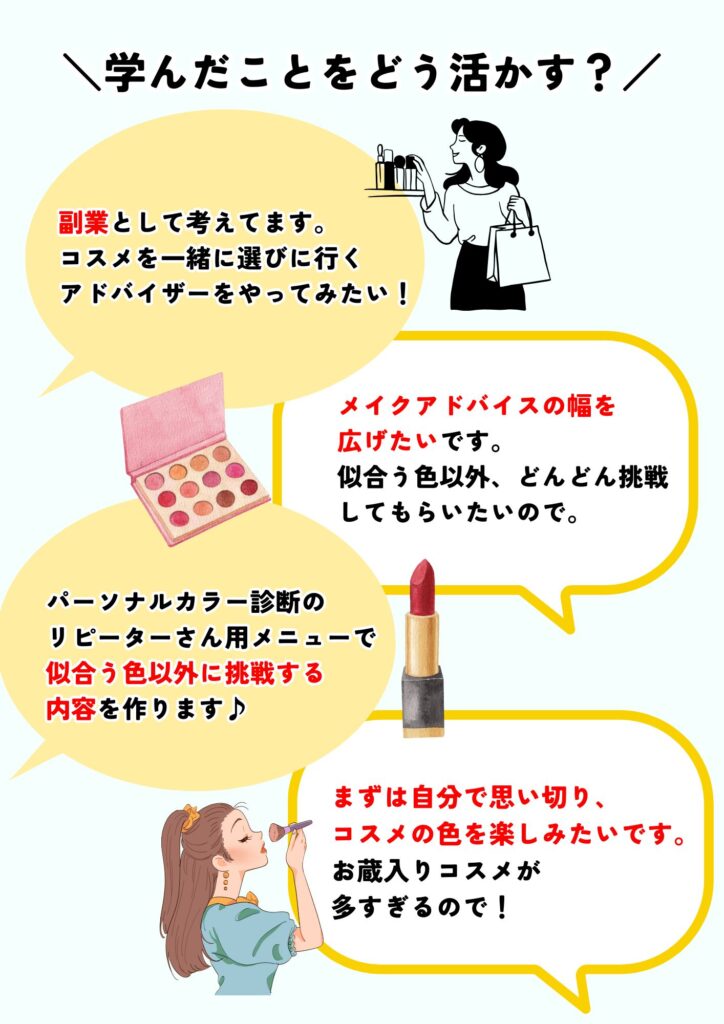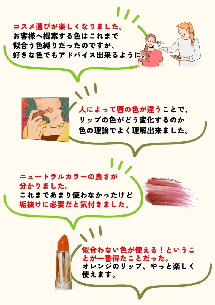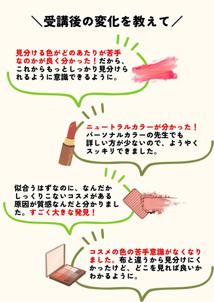 受講後は、自分でコスメの色を診断出来るようになり、似合いにくい色のコスメでも似合わせメイクや色のアドバイスが出来るようになります。