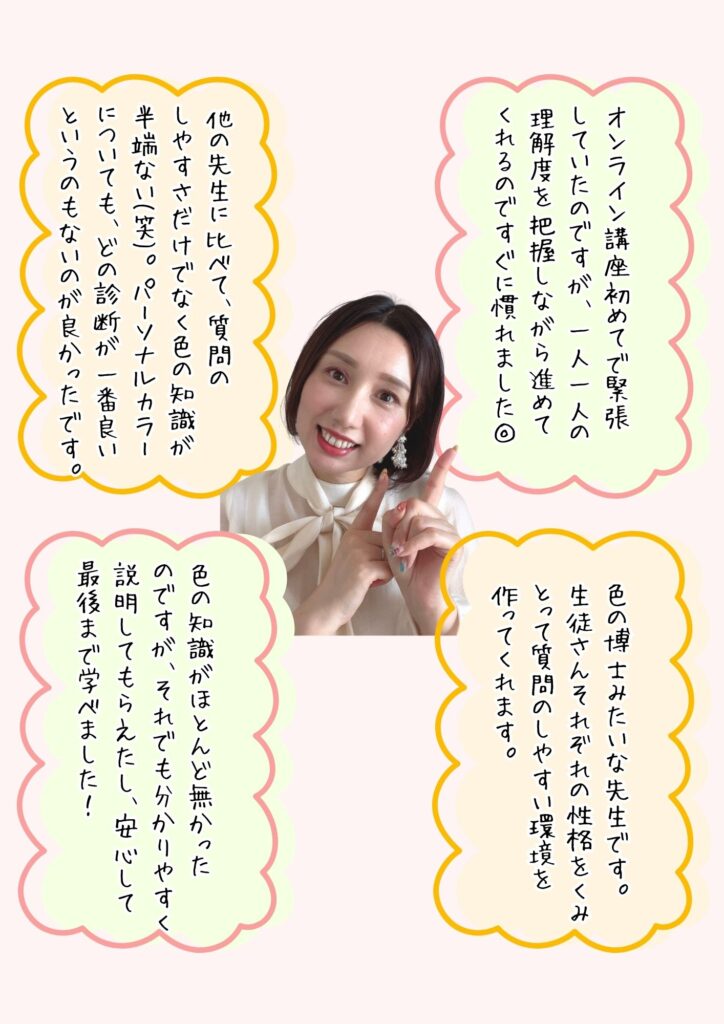 いいえ。専門的な知識は必要ありません。パーソナルカラーの4シーズン(春夏秋冬)の意味が分かれば大丈夫です。これまでパーソナルカラーのスクールを卒業していない方も多くご参加されています。