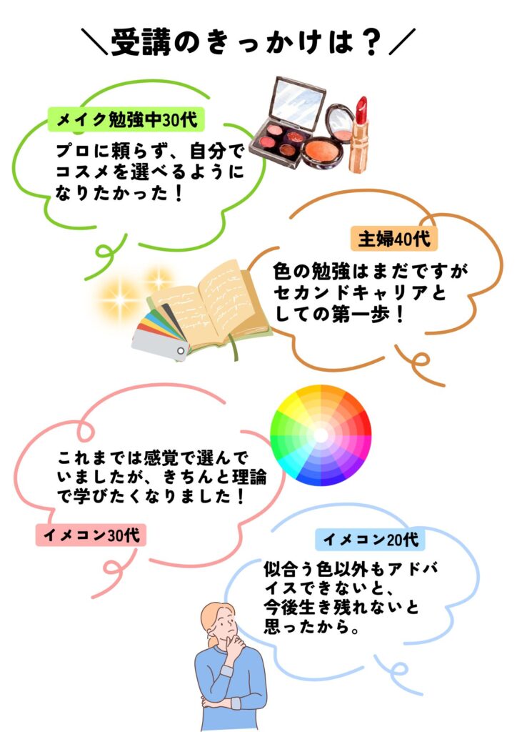 ・女性をキレイに、色を楽しく使えるアドバイザーとして活動したい方。