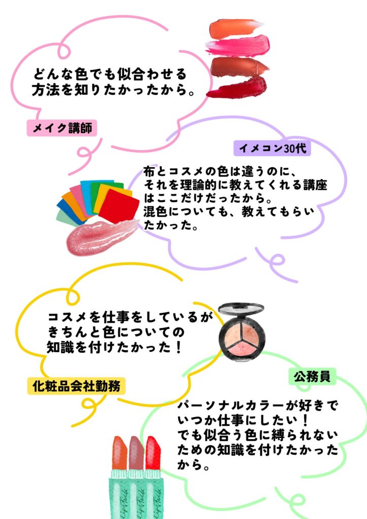 「色を仕事にしたい方」「将来、セカンドキャリアや副業にしたい方」が多く、会社員の方や学校の先生、主婦の方など様々です。もちろん現在コスメに関わるお仕事の方、大手コスメ会社さんの企画の方も受講されています。